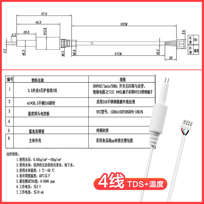 2-wire TDS probe, 4-wire TDS+ temperature probecolor