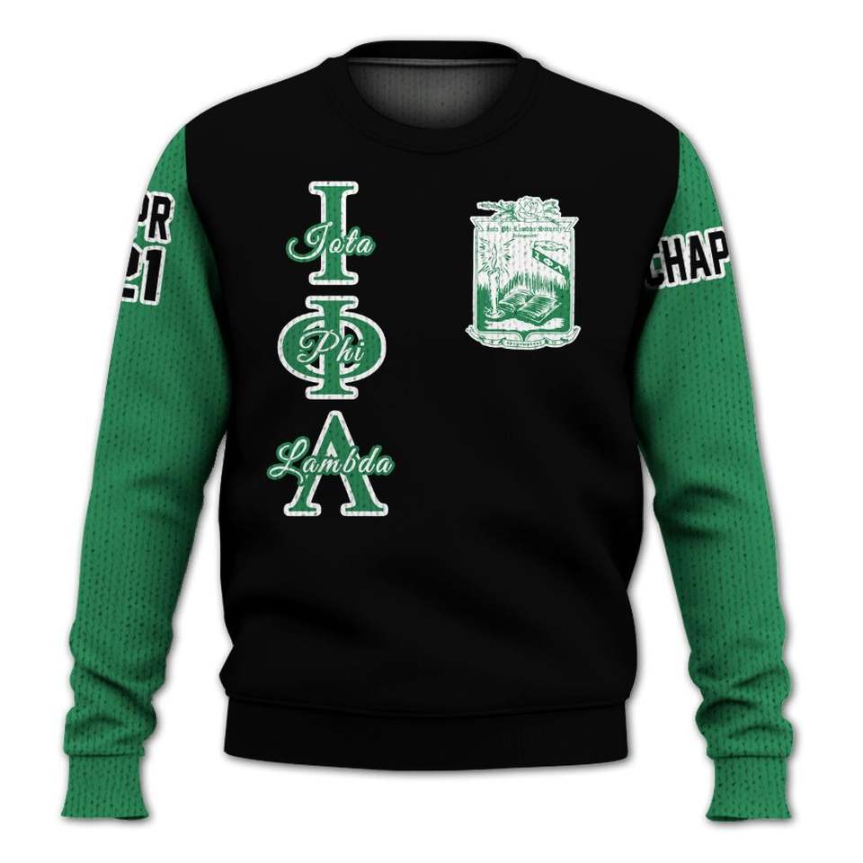 Iota Phi Lambda Custom Personalized Black Mix Emerald Green Varsity Jacket Iota Phi Lambda Sorority Knitted Sweater
