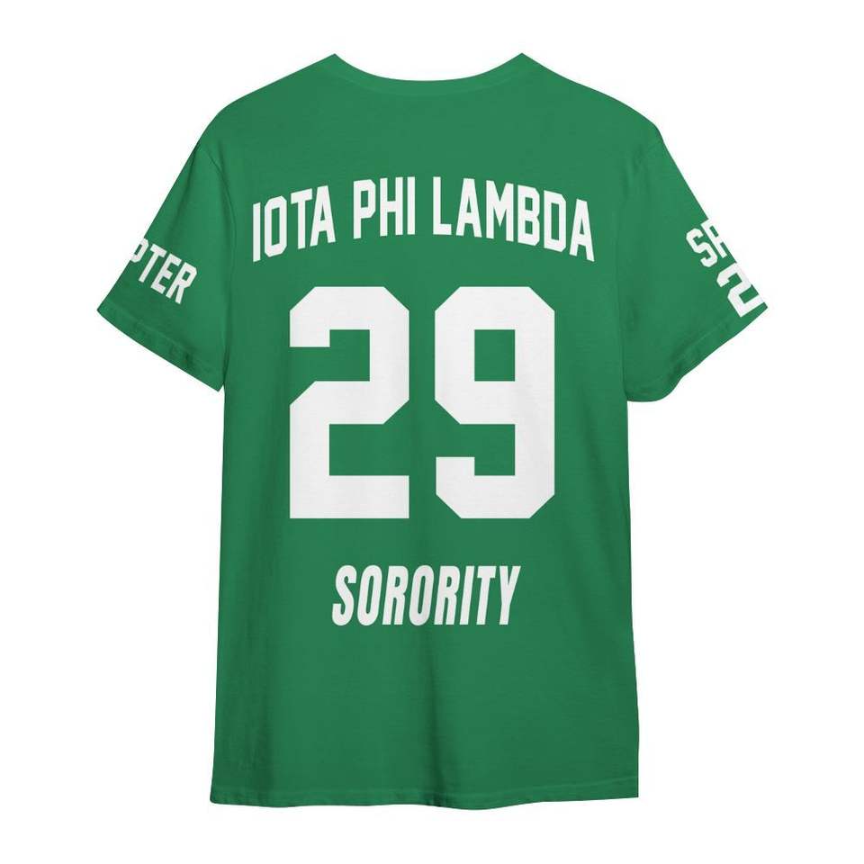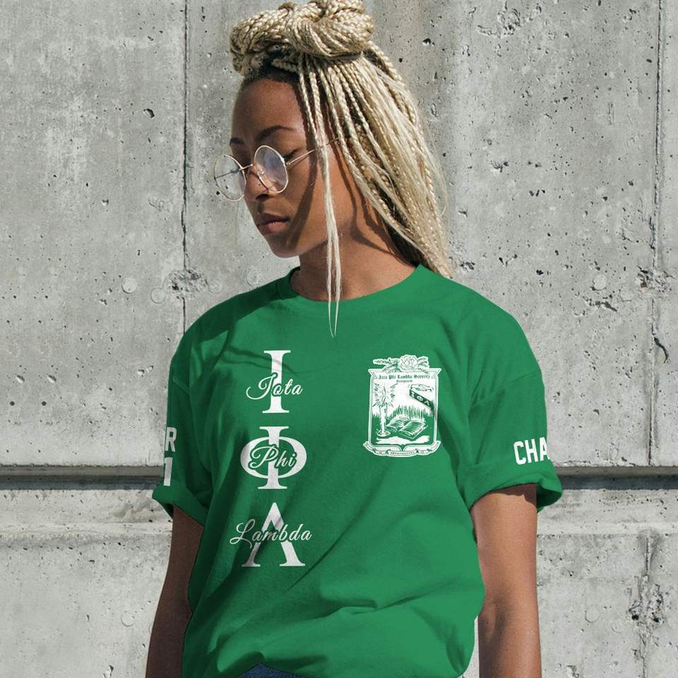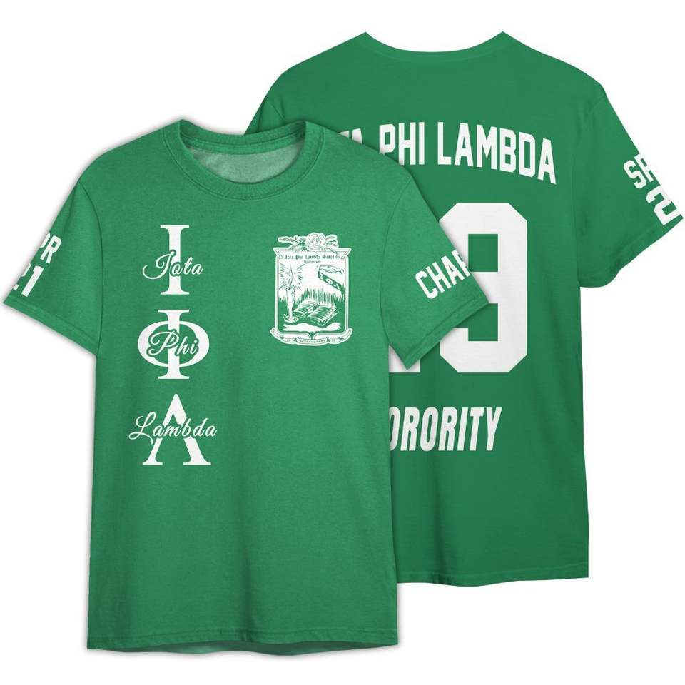Iota Phi Lambda Emerald Green Crew Neck T Shirt Custom Chapter Letter Print Womens Unisex Fit Greek Inspired Casual Tee