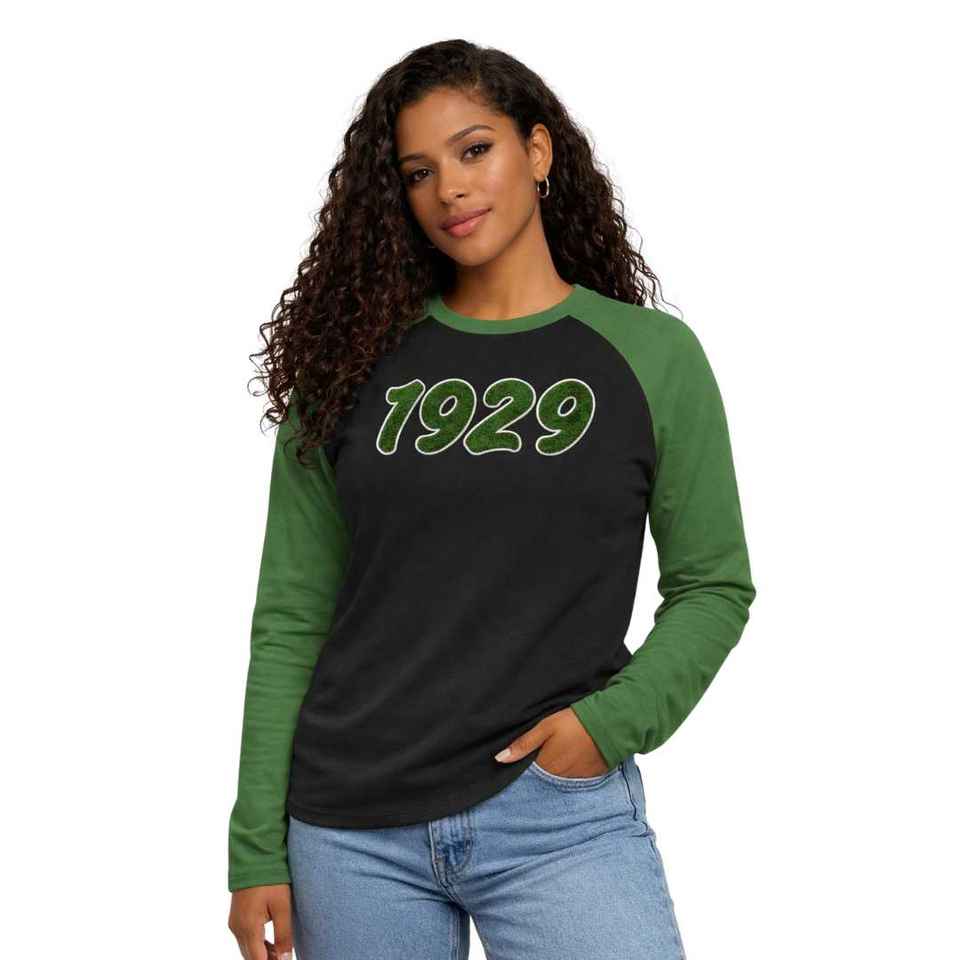 Iota Phi Lambda Sorority Black Raglan Long Sleeve Shirt Founding Year 1929 Emerald Green Sleeves Greek Letter Apparel Womens Top