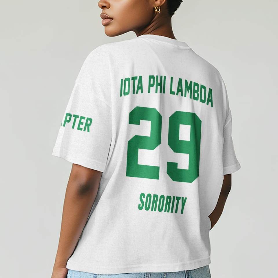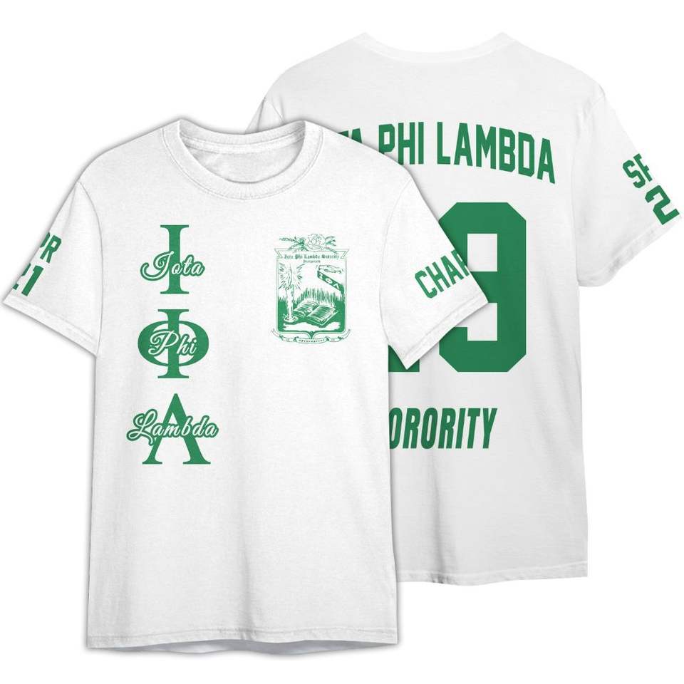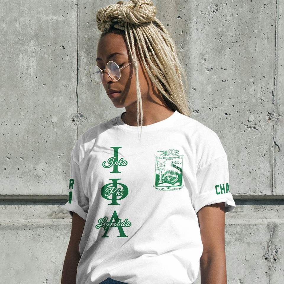 Iota Phi Lambda White And Green Crew Neck T Shirt Custom Chapter Print Womens Unisex Fit Greek Inspired Short Sleeve Tee
