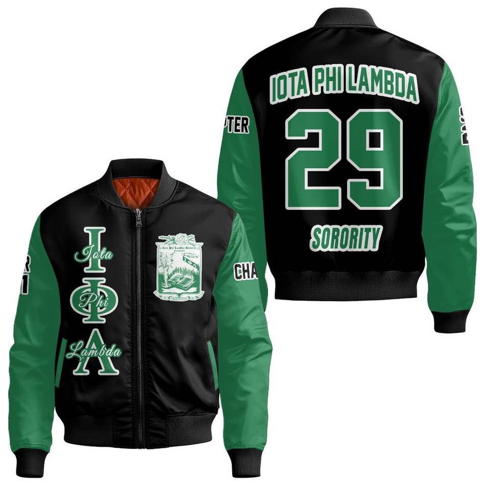 Iota Phi Lambda Women Custom Chapter Bomber Jacket Black Emerald Green Mix Greek Letter Crest Front Back Year Zip Jacket
