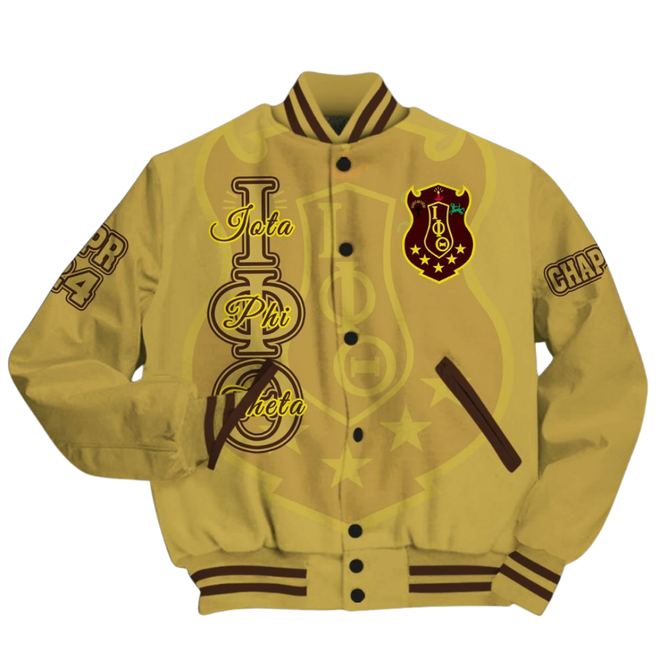 Iota Phi Theta Brown Gold Greek 1963 Varsity Jacket Letterman Fraternity Apparel Premium Classic University Outerwear