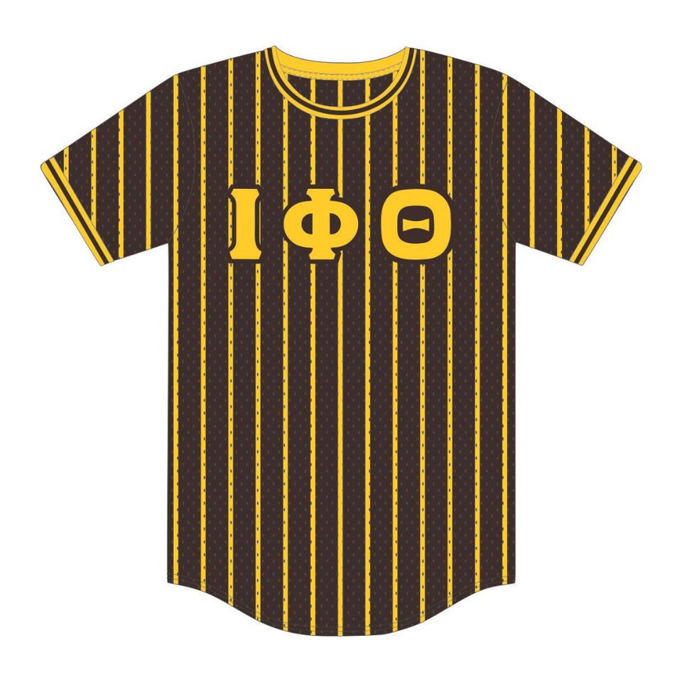 Iota Phi Theta Brown Pinstripe Pullover Baseball Jersey 100% Polyester Mesh Fraternity T Shirt with Embroidered Applique Logos