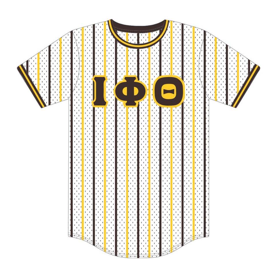 Iota Phi Theta White Pinstripe Pullover Baseball Jersey 100% Polyester Mesh Fraternity T Shirt with Embroidered Applique Logos
