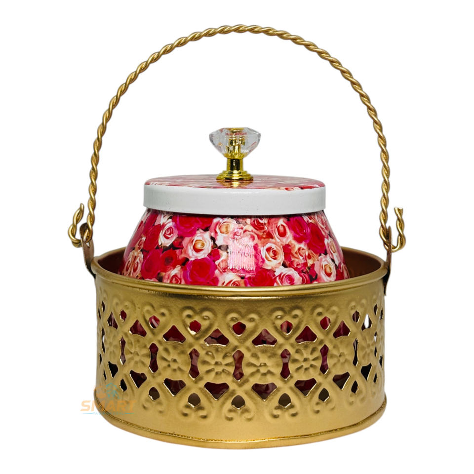 Iron Printed Pichwai Design Dry Fruit Jar with Decorative Basket Set for Food Storage & Gifting