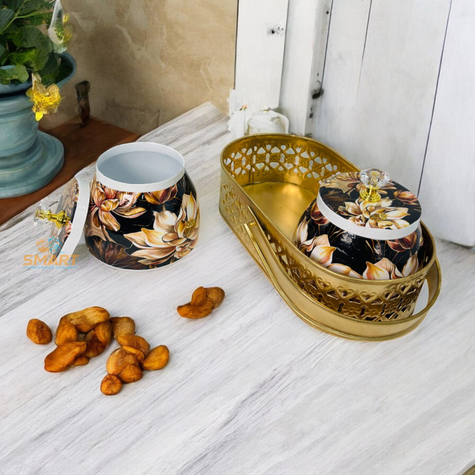 Iron Printed Pichwai Design Dry Fruit Jar with Basket Set Festive Decor Gifting & Food Storage Container