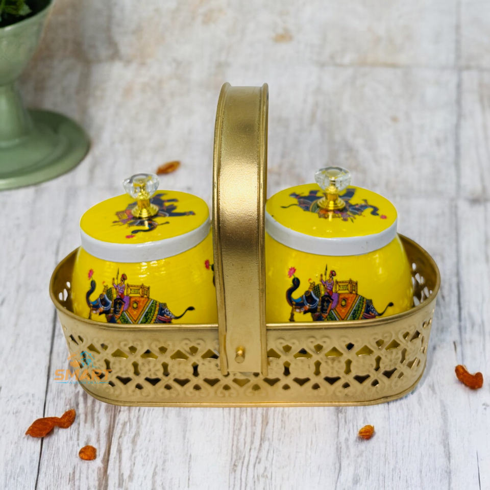 Iron Printed Pichwai Design Dry Fruit Jar with Festive Basket Set Kitchen Food Storage Container and Gifting Essential