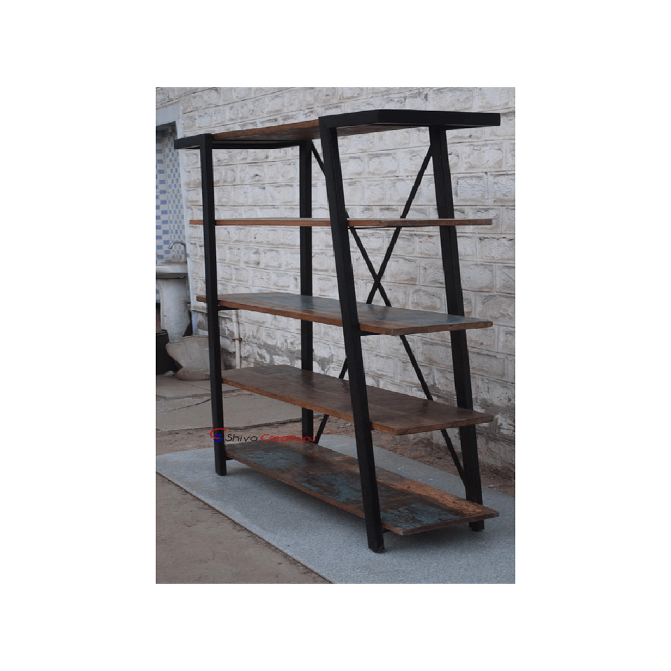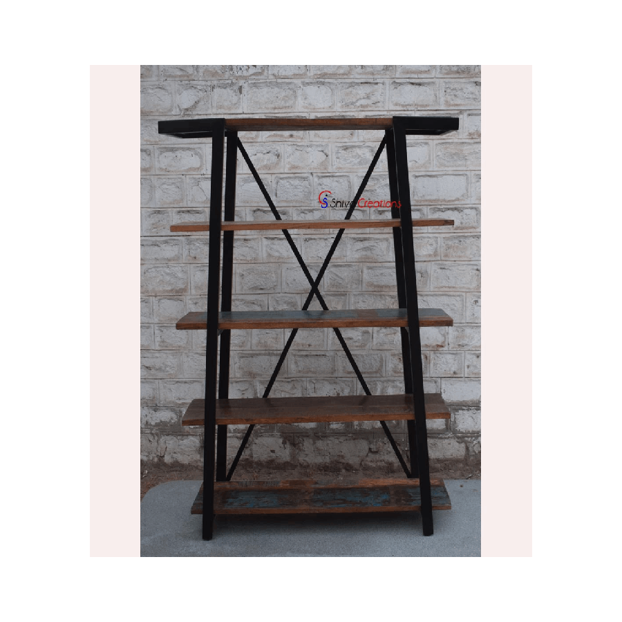 Iron Wooden Folding Bookrack 130x38x180 cm Industrial Design Metal Black and Wood PP Wax Bookshelf for Living Room