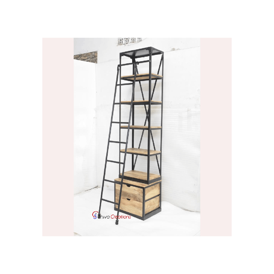 Iron Wooden Ladder Bookrack Industrial Design 20x18x95 Inches Metal Black and Natural Wood Finish Bookshelf