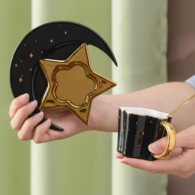 Irregular Nordic Star Moon Shape Plate Gold Handle Ceramic Tea Cup and Saucer Gift Set Porcelain Espress Coffee Mug