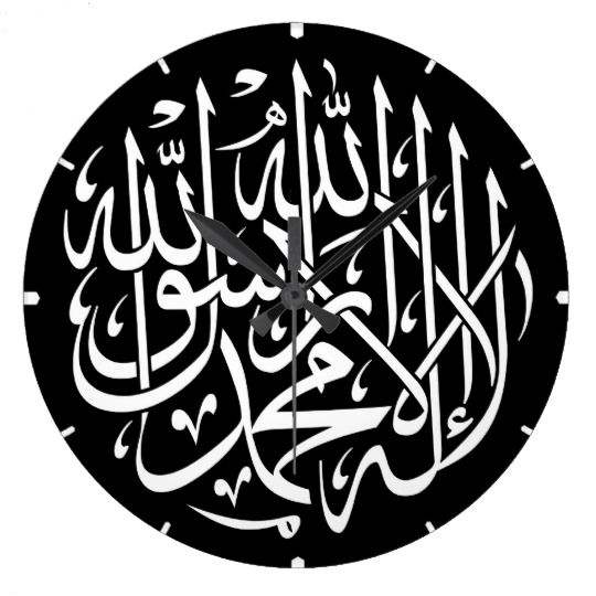 Islamic art wall clock in metal with kalma calligraphy and Arabic digit display perfect for Muslim homes