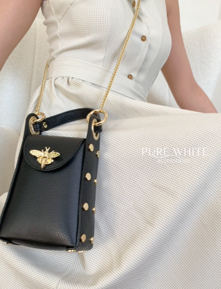 Italian Handmade Genuine Leather Mini Top Handle Bag with Bee Snap Closure