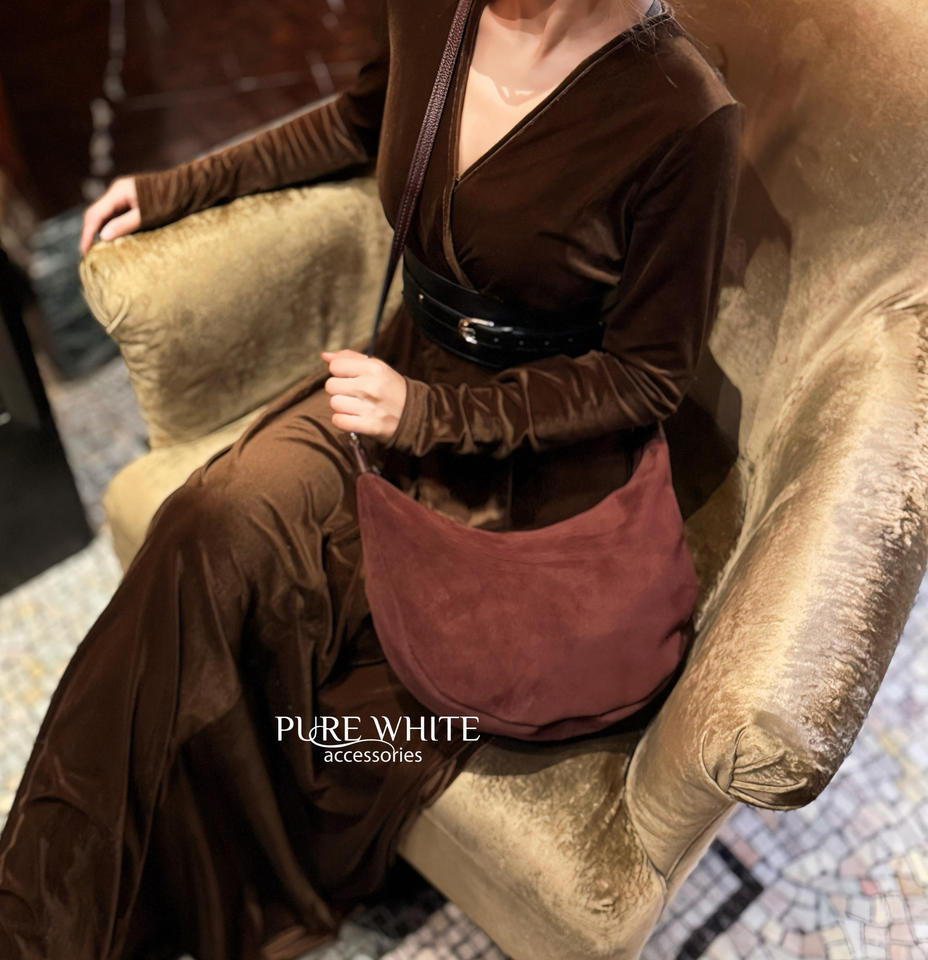 Italian Handmade Suede and Genuine Leather Curved Shoulder Bag with Adjustable Strap