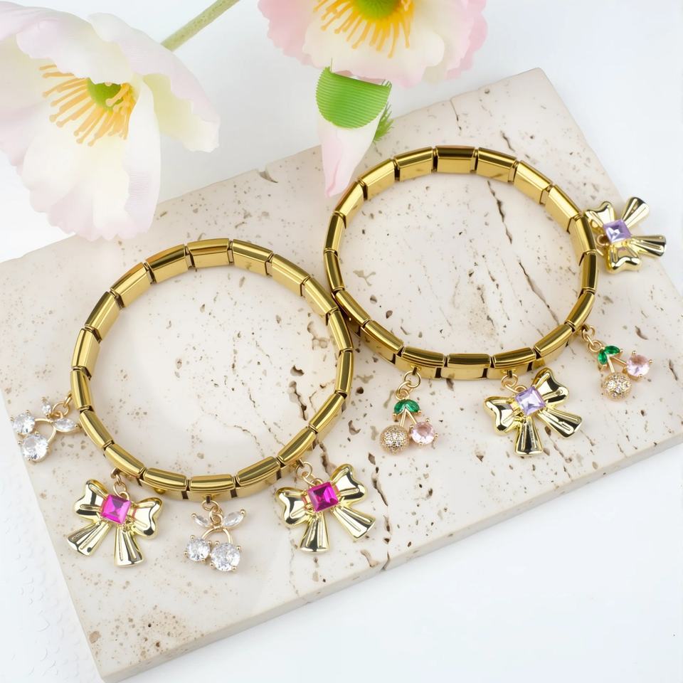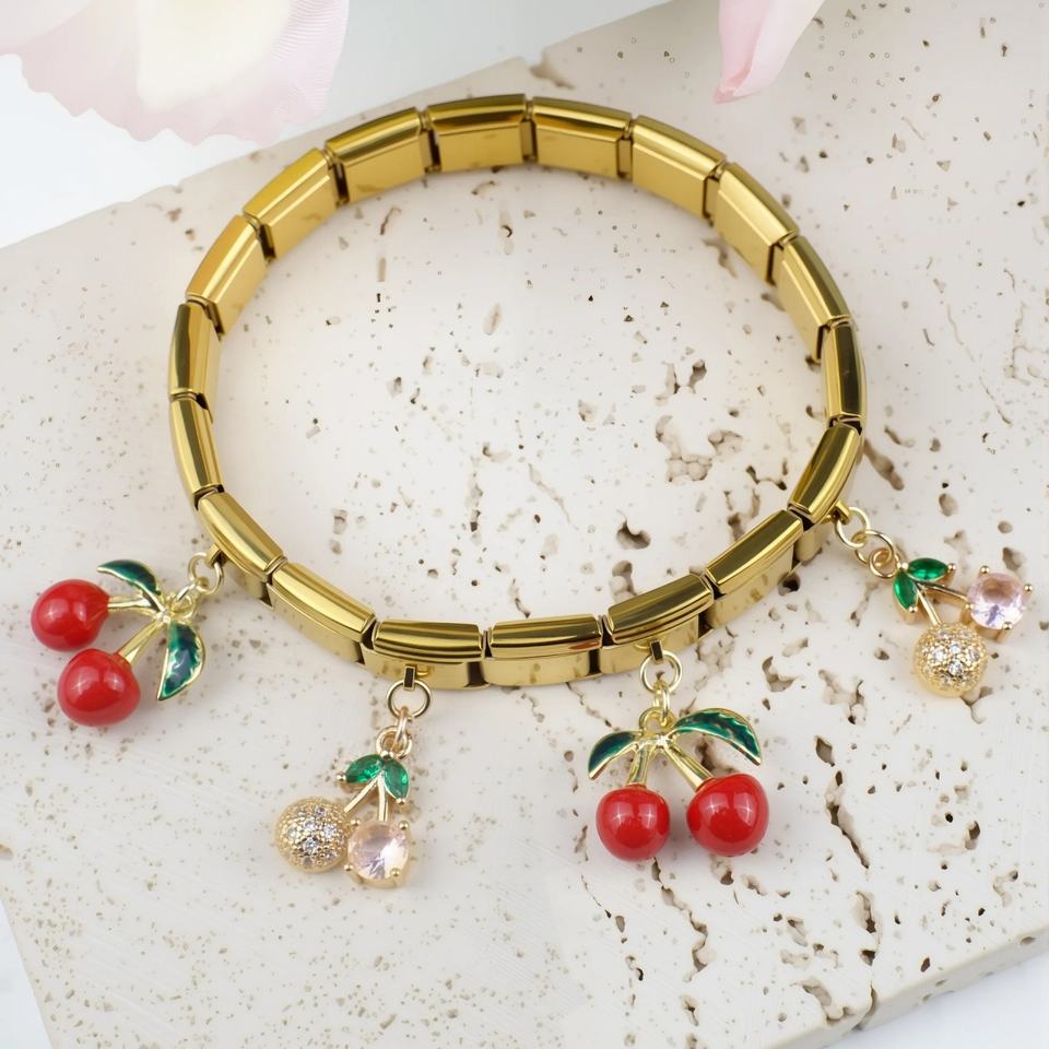 Italian Link Bracelet Interchangeable Modular Dangle Charms Cherry Bow Gold Tone Stainless Steel for Women Christmas Gift