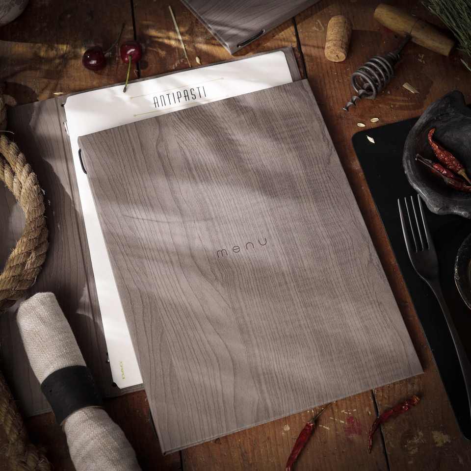 Italy A4 Porta Menu 2-Pocket (4-Sides) Black Elastic 23.2x32 cm 'Menu' Writing Color Rovere for Hotels & Restaurants