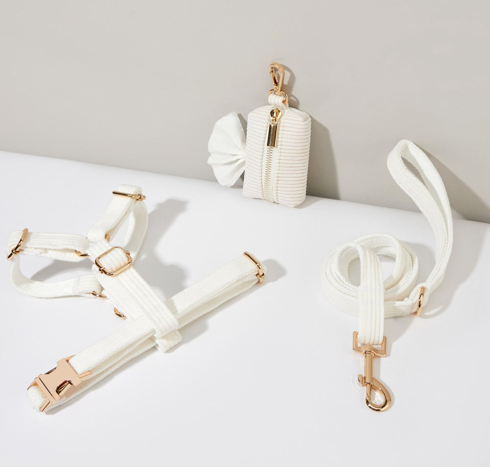 Ivory Corduroy Wedding Dog And Leash Set Personalised With Name Engraved Soft Harness Bow Tie Collar Set