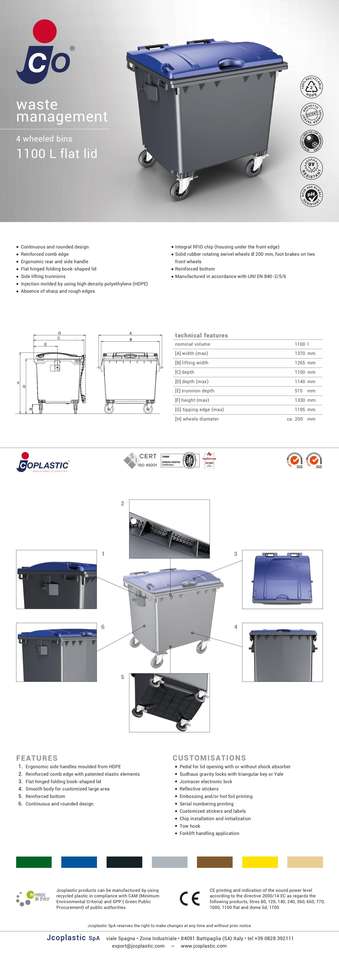 JCOPLASTIC SPA Custom Service High Density HDPE 1100L Waste Management Bin 4 Wheeled Yellow RAL 1018 Flat Lid Sustainable Option