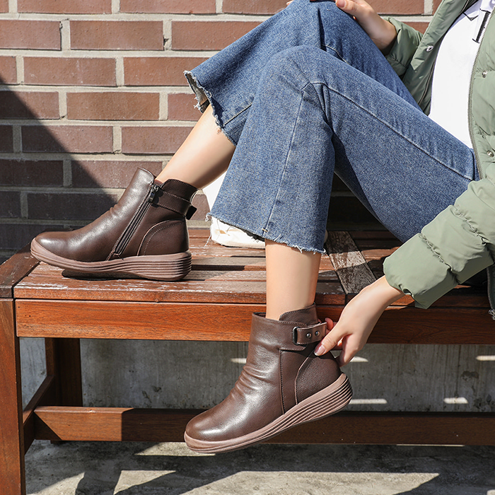 [JSHOE] Genuine Cowhide Fur Lined Ankle Boots 5cm Heel Comfortable Warm Winter Short Booties Non Slip Soft Sole for Women
