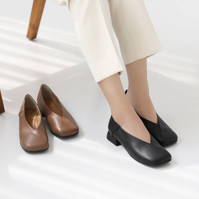 [JSHOE] Handmade Genuine Lambskin Square Toe Flat Shoes for Women 2cm Low Heel Soft Sole Simple Daily Comfort Leather Loafers
