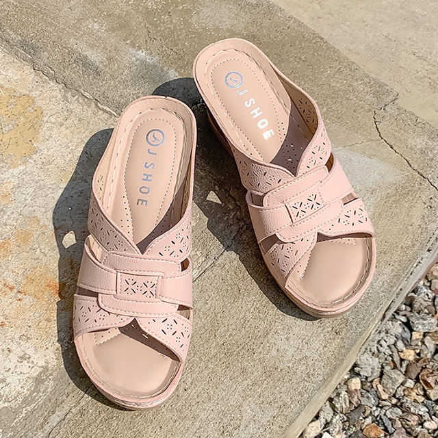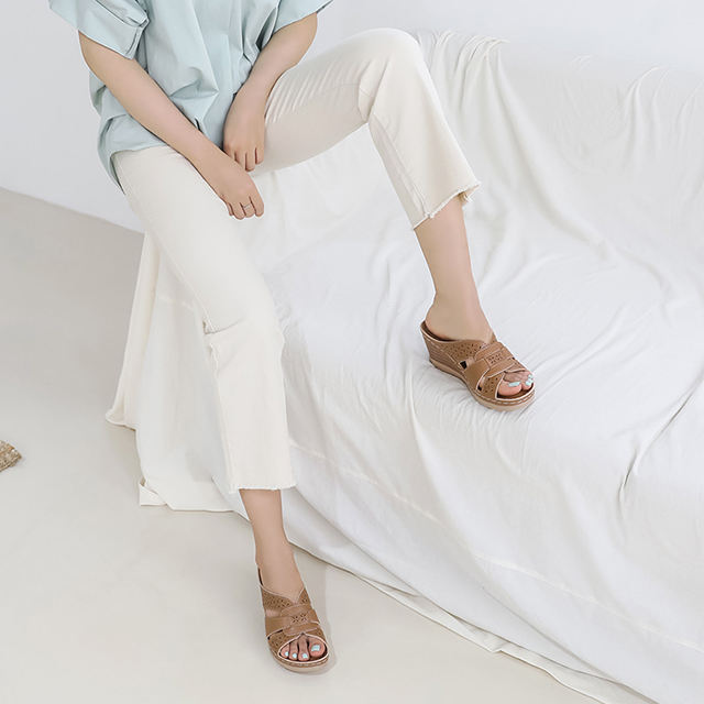 [JSHOE] Laminated Cowhide Lightweight Wedge Heel Mule Slippers for Women Comfortable Summer Open Toe Daily Walking Sandals