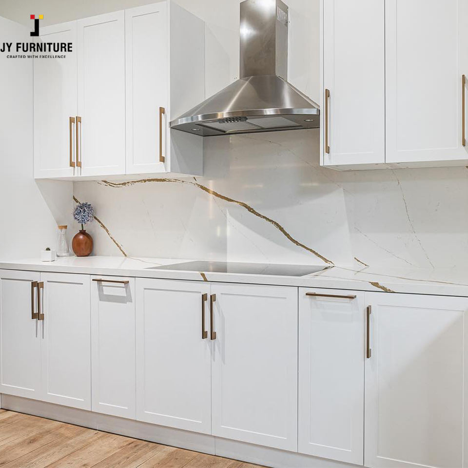 JY Vietnam European Design Kitchen Cabinet RTA Customized Large Storage with White Hardwood Carcass New Marble Countertop Hinge