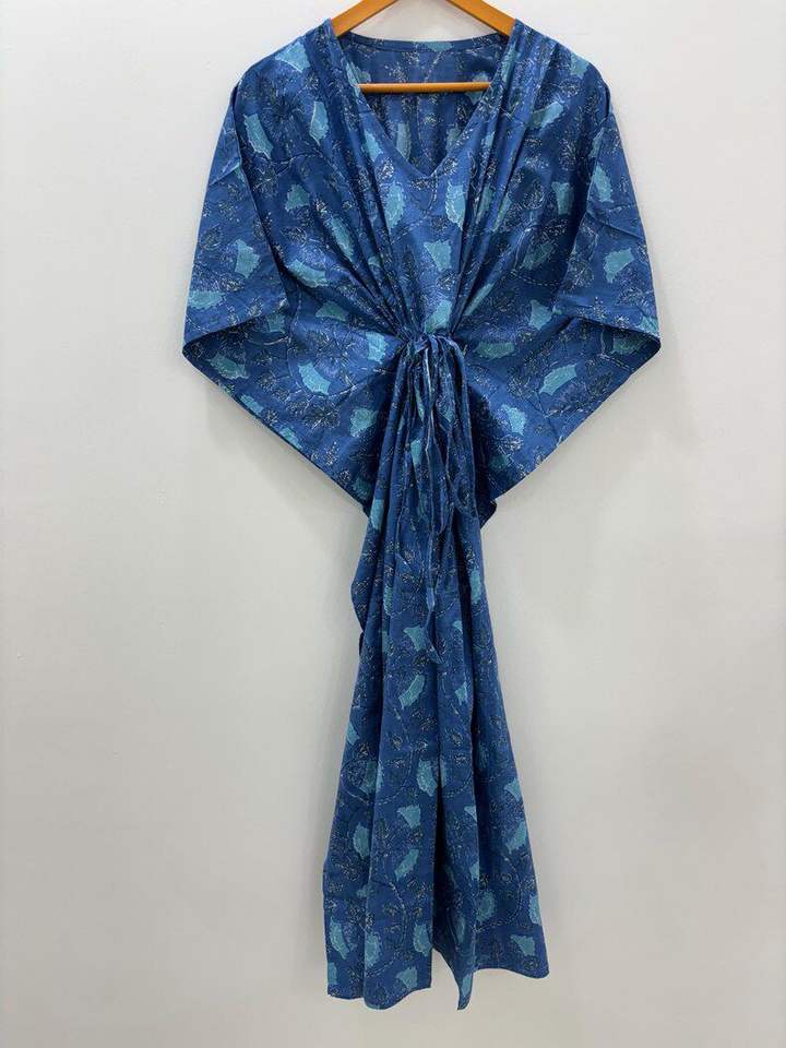 Jaipur Blue Hand Block Print Caftan Indian Handmade Boho Hippie Sleepwear Summer Maxi Tunic Dress for Women Floor Casual Dress