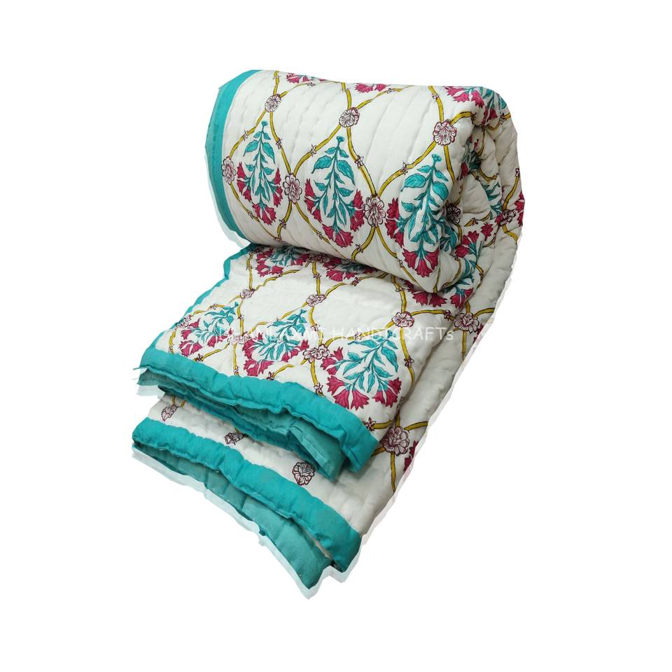 Jaipuri Floral Palm Tree Printed Quilts Hand Block Print Cotton Designer Kantha Quilts Rajai
