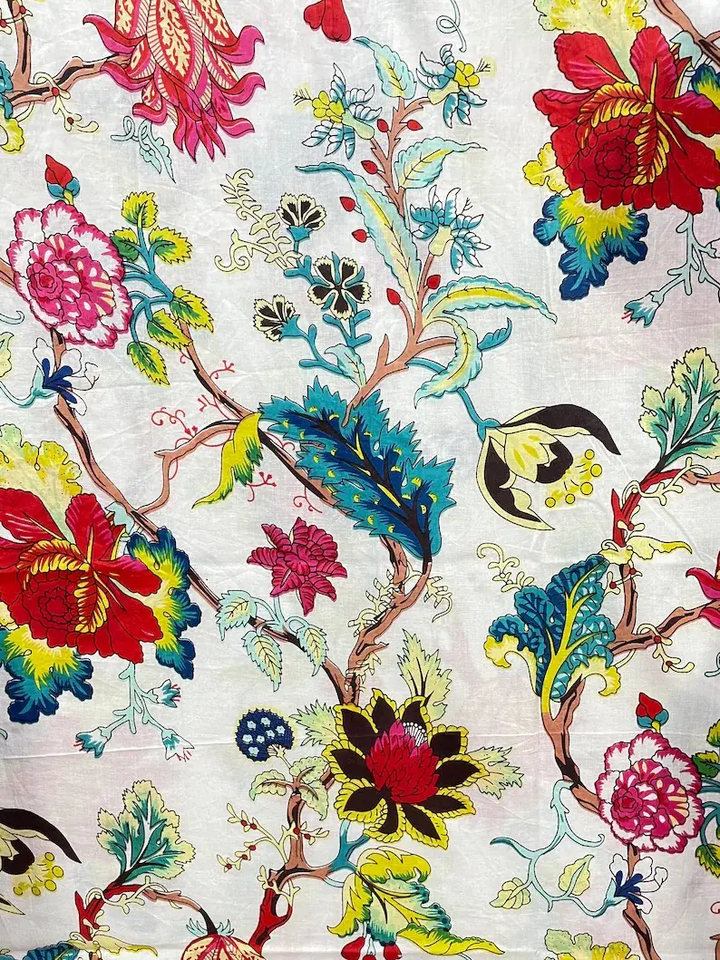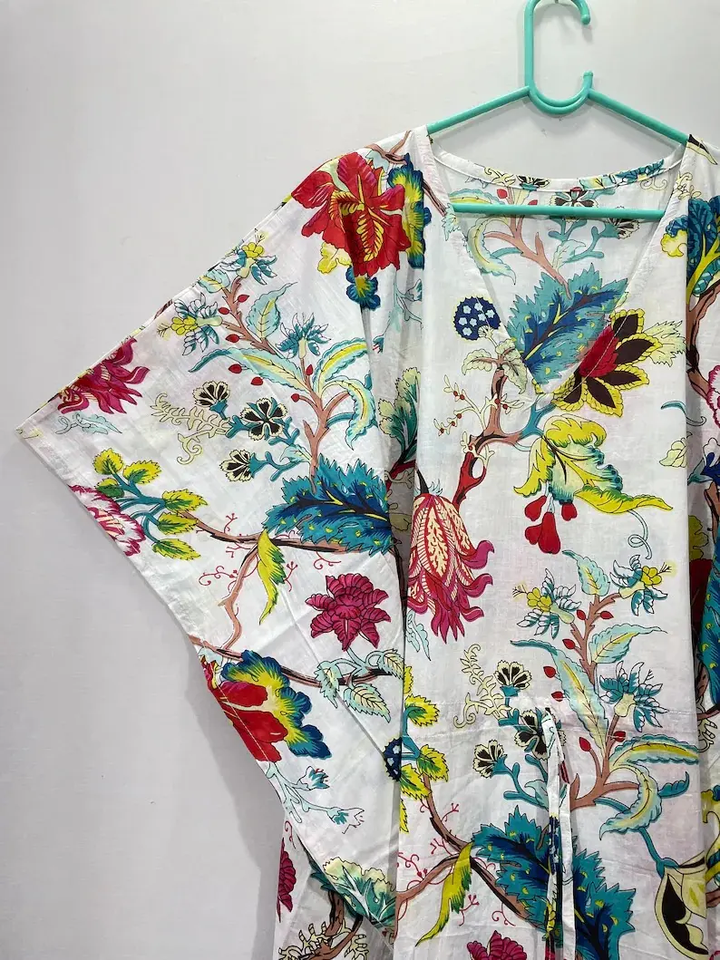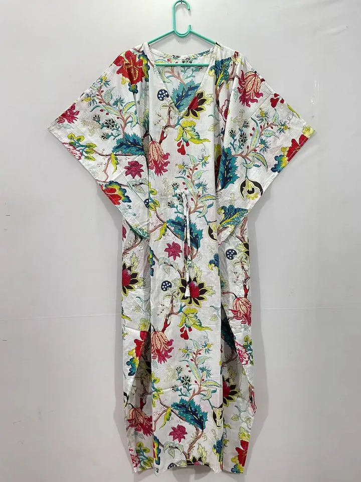 Jaipuri Print Cotton Handmade Kaftan Dress Long Top Beach Cover with Short Sleeves Flower Block Pattern for Party Adults Size