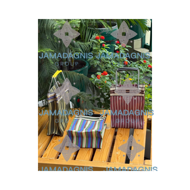Jamadagnis Group Recycled Nylon Mini Handbag Striped Pattern Red Yellow Shopping Bag with Body Material Handles for Daily Use