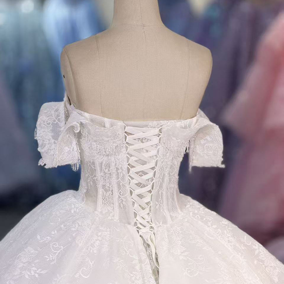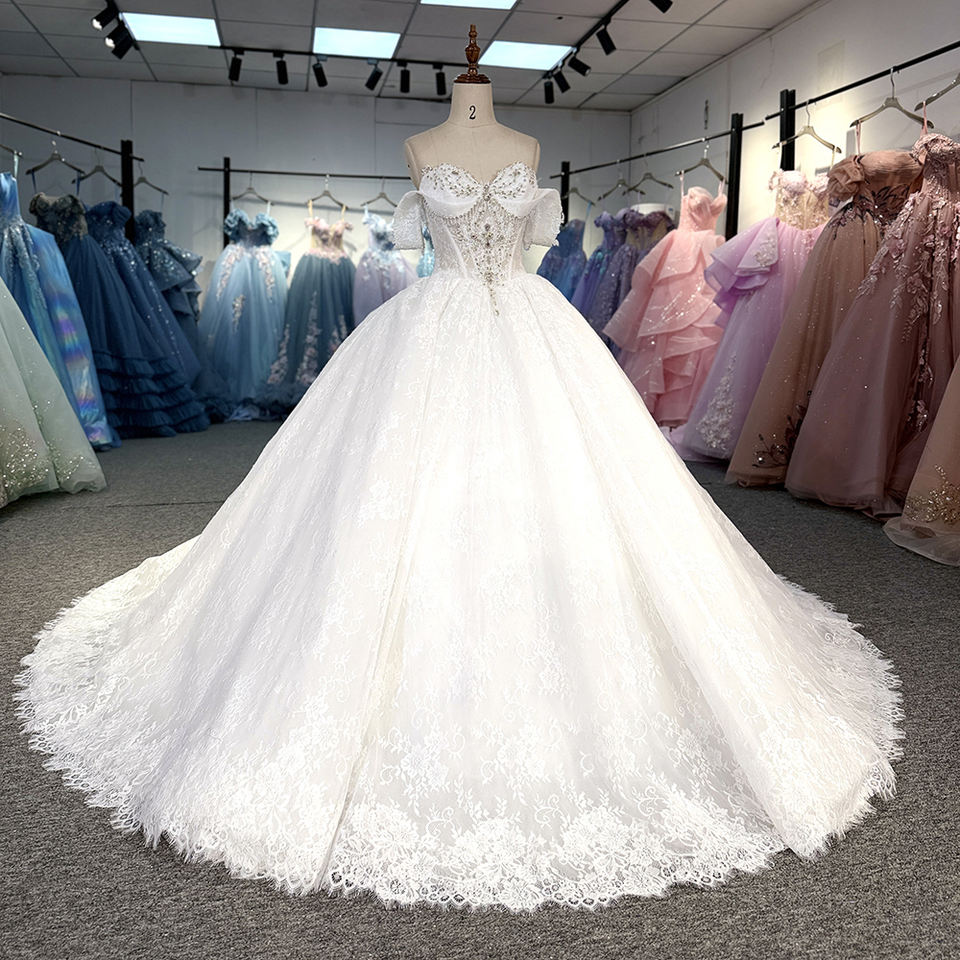 For 6991 Beach Lace Beading Appliques Crystal Puffy Bridal Wedding Gown Natural Waistline Print