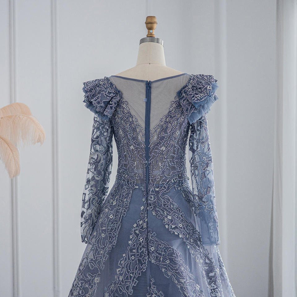 Jancember LSCZ300 Navy Lace Long Sleeve Evening Dresses Elegant Lady Party Prom Dresses 3D Pattern Appliques Natural Waist