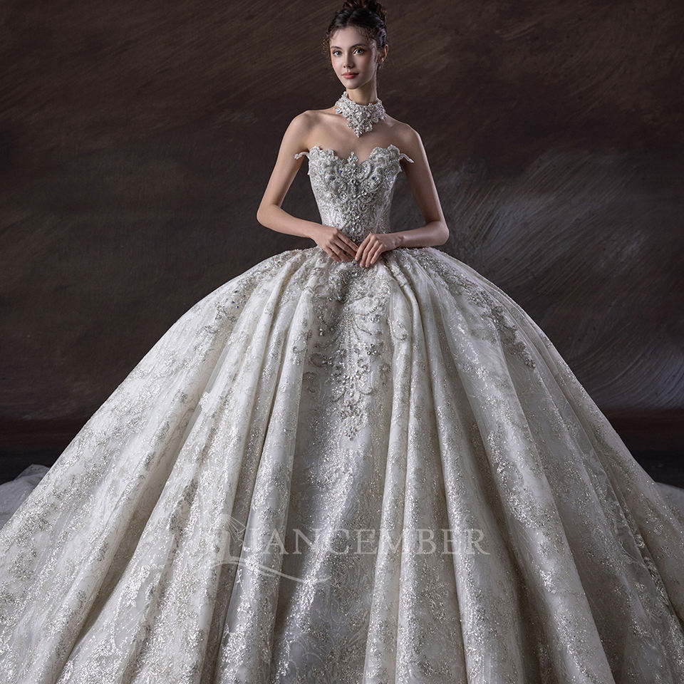 For LSHT073 Modern Luxury Heavy Beaded Floral Crystal Appliques Sweetheart Ball Gown Wedding Dress Chapel Train Sleeveless