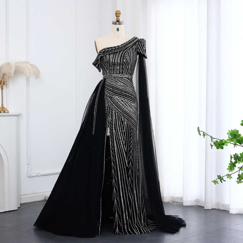 For LSZ025 Vintage One Shoulder Black Beaded 3D Pattern Feather Pleat Floor-Length Mermaid Evening Dresses for Party