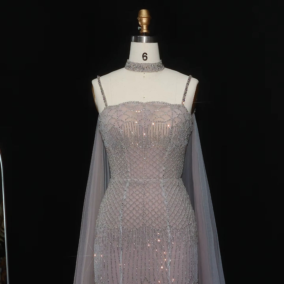 For LSZ509 Elegant 3D Beaded Lotus Pink Mermaid Floor-Length Evening Gown Sheer Cape Feathers for Women Wedding Party