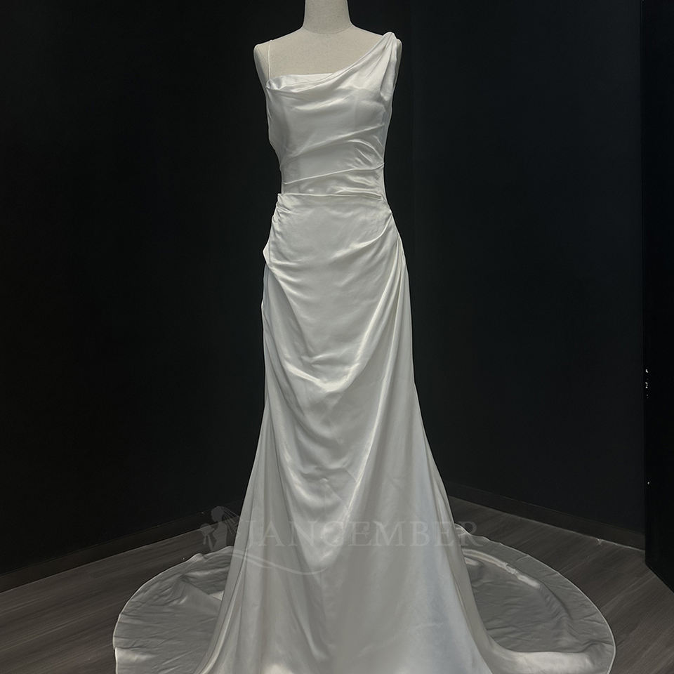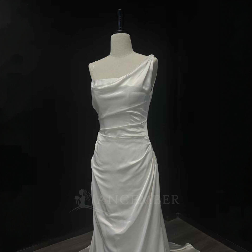 For NT29 Modern Long Glossy Backless Lace One Shoulder Crystal Flowers Appliques Chapel Train Satin Slim Mermaid Wedding