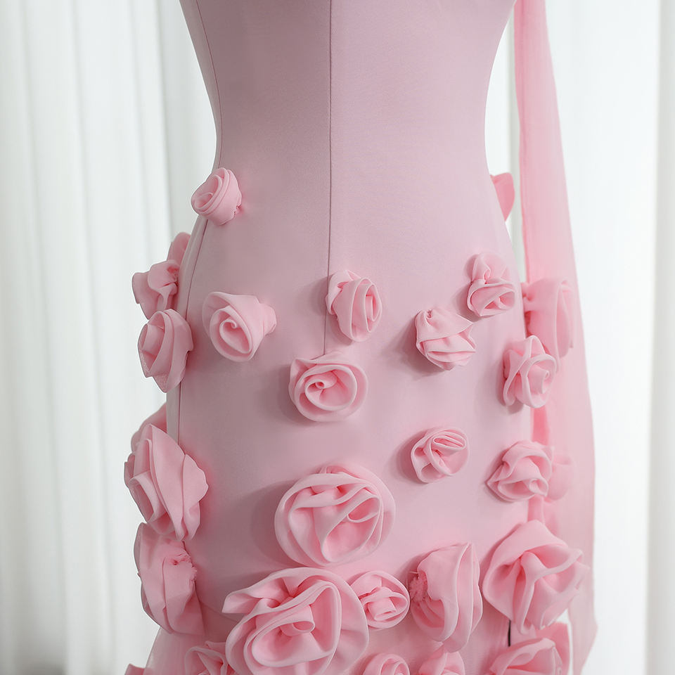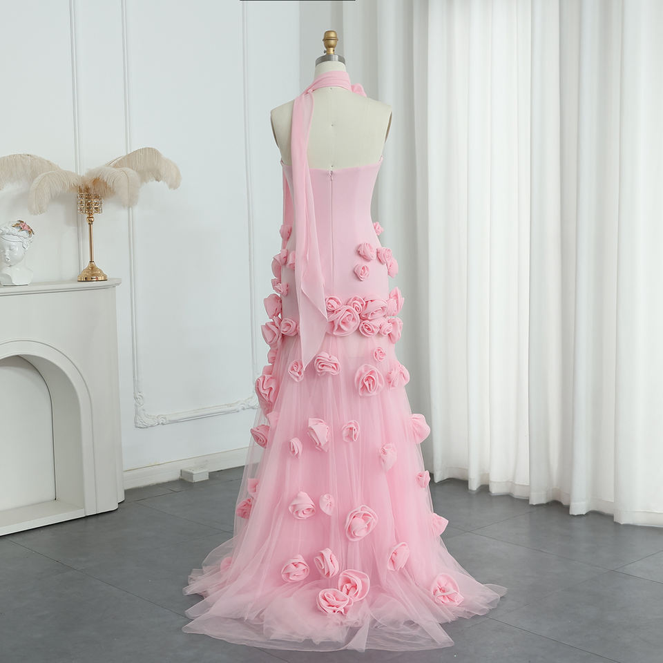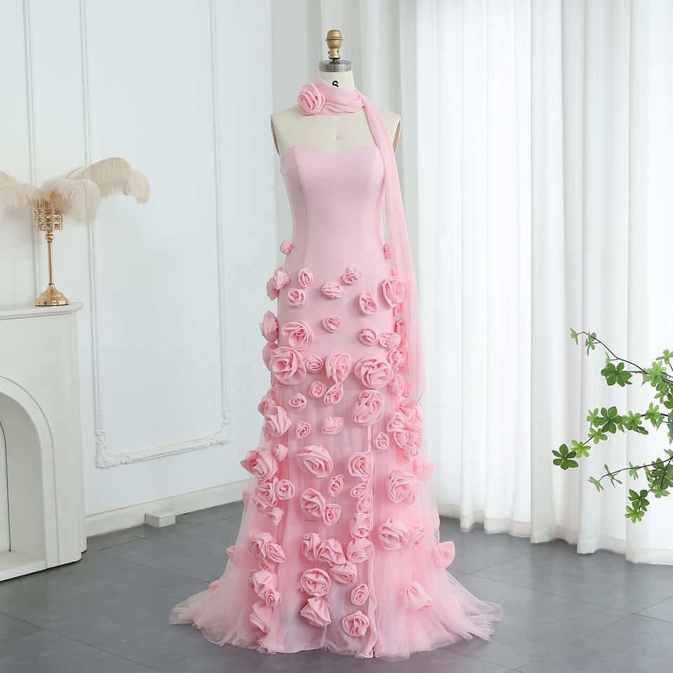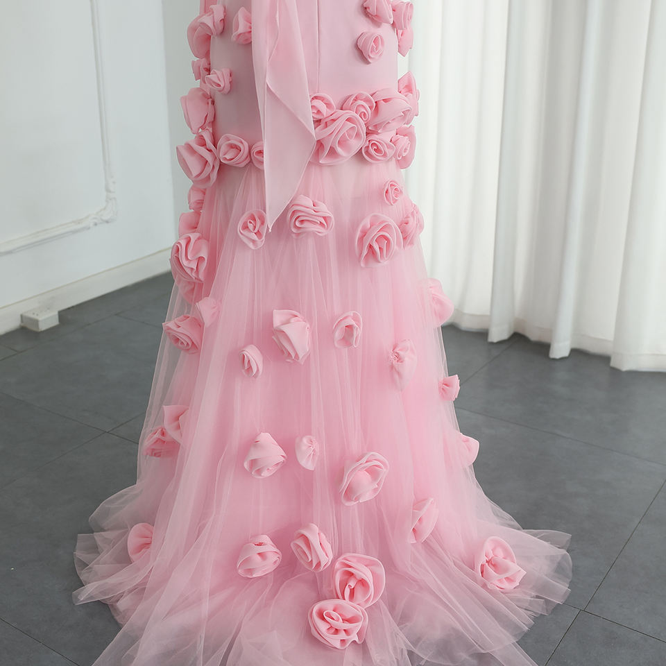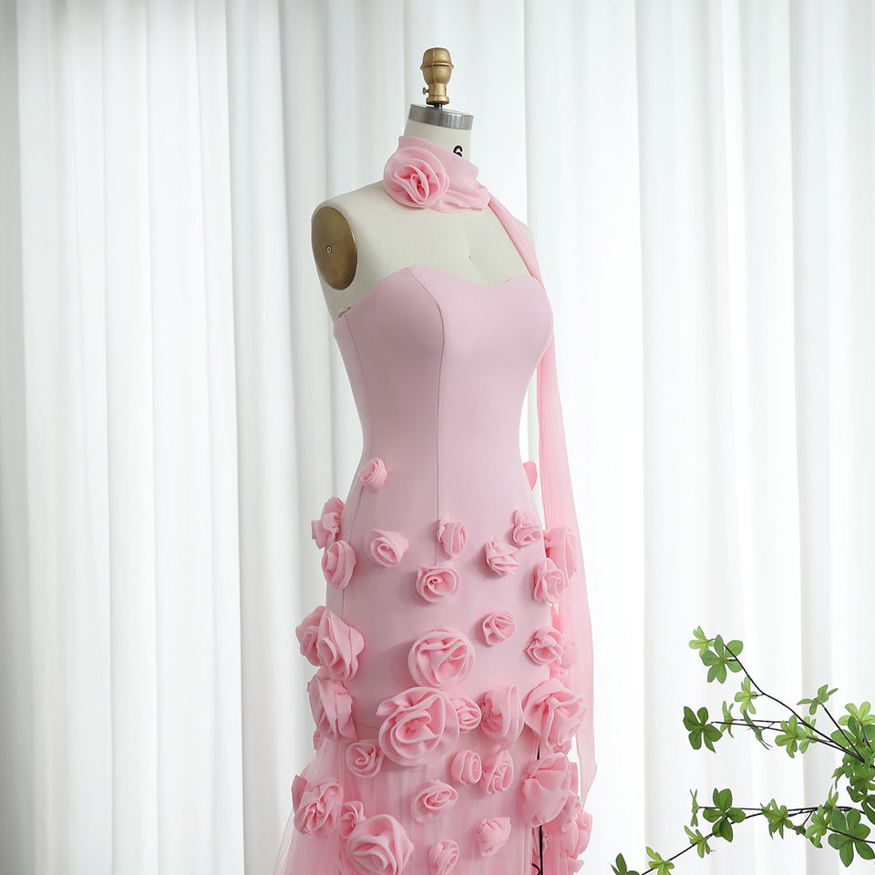 For SF009 Exclusive Pink Sleeveless 3D Flower Crystal Feathers Pleat Floor-Length A-Line Organza Evening Party Dresses