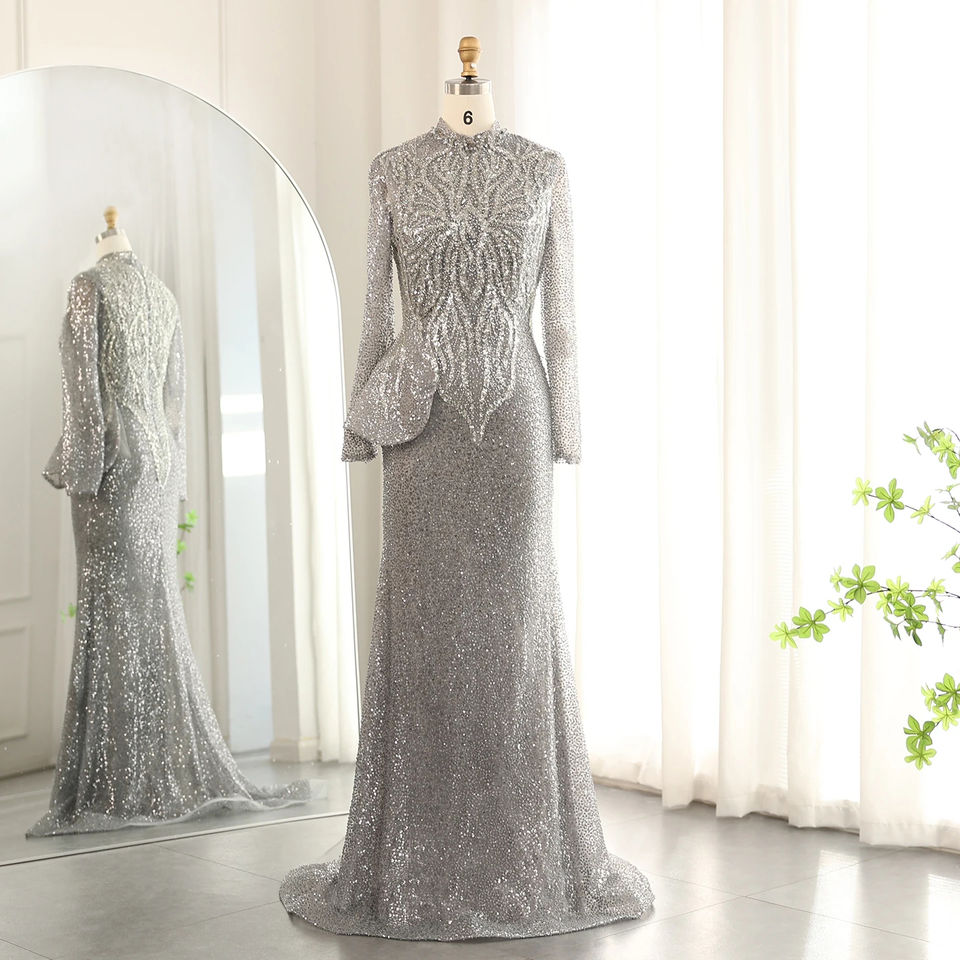 Jancember SZ130 Bling Muslim Silver Trumpet Mermaid Prom Dresses for Girls