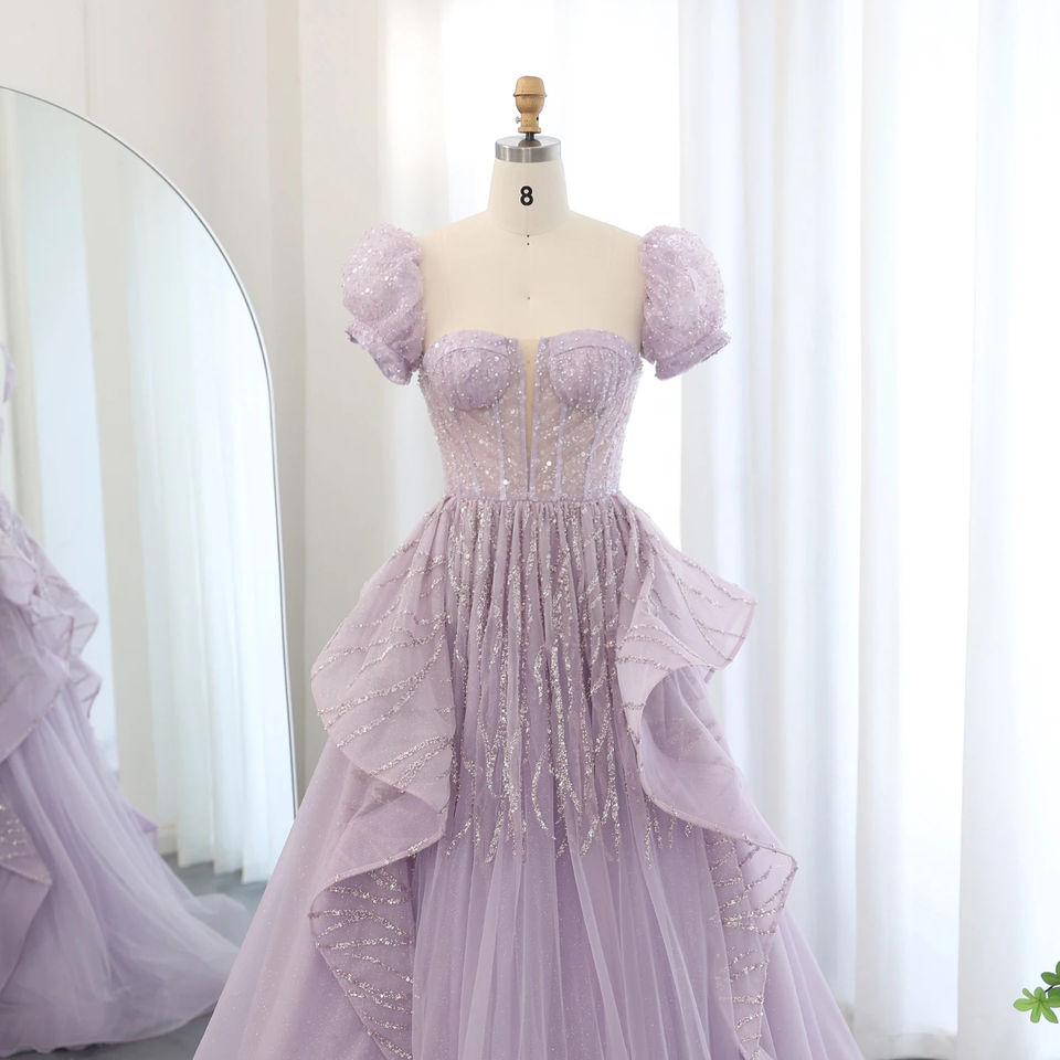 Jancember SZ452 Elegant Short Sleeve Lilac Evening Party Women's Gowns Dresses
