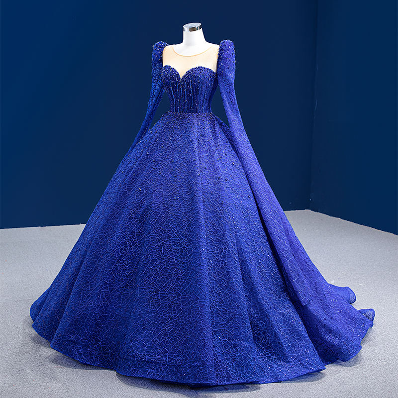 Jancember Vintage Blue O-Neck Ball Gown Evening Dress Women Plus Size Embroidered 3D Beaded Decoration Puff Sleeves Chapel Train