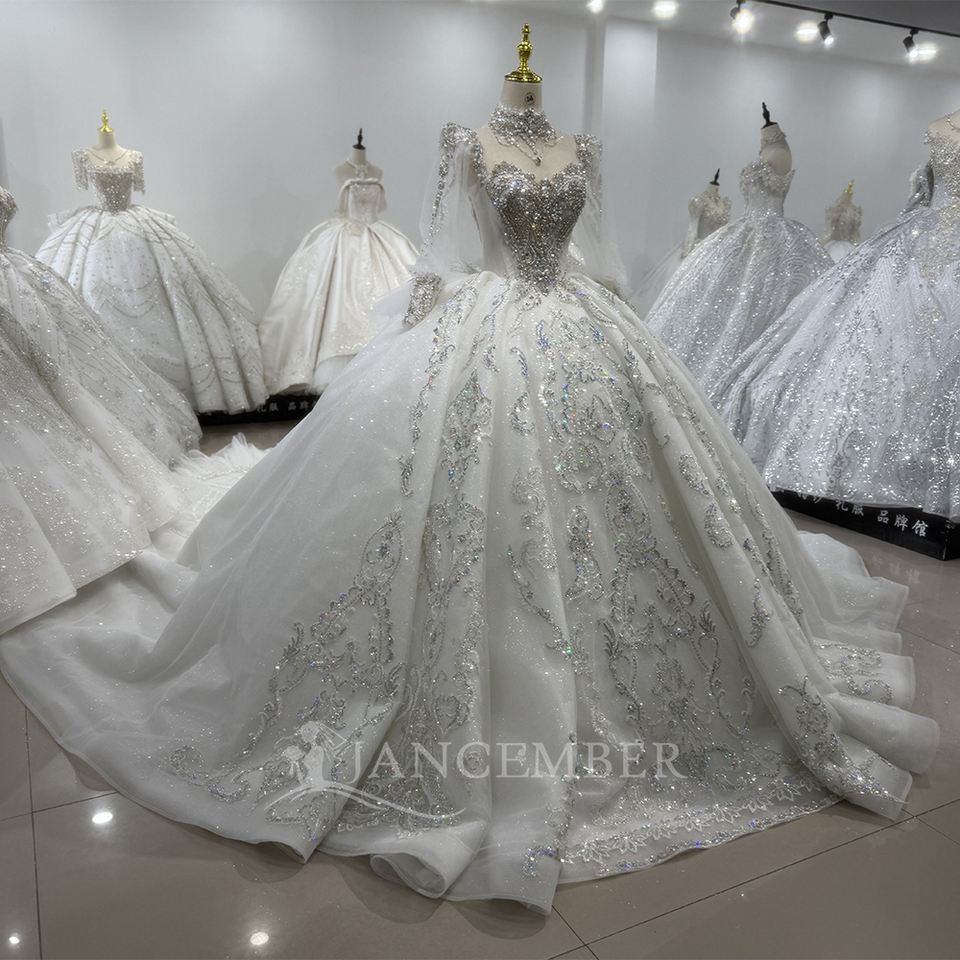 Jancember XS180 Exquisite White Wedding Dress Long Sleeves Glittering Silver Decor Vestidos de Noiva