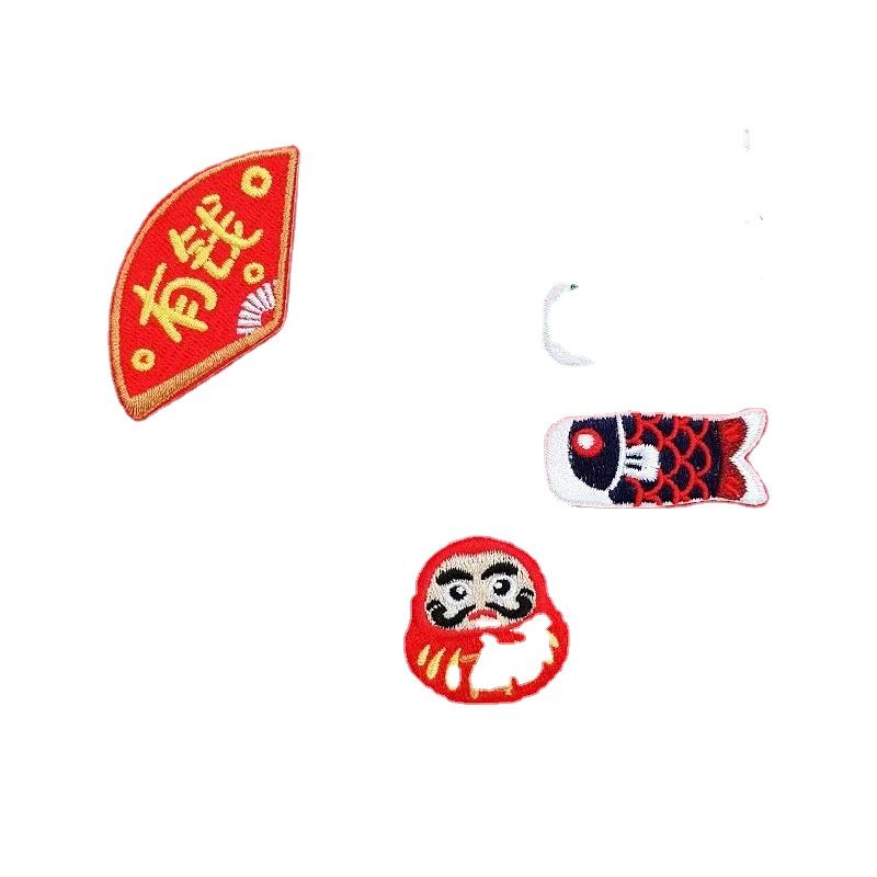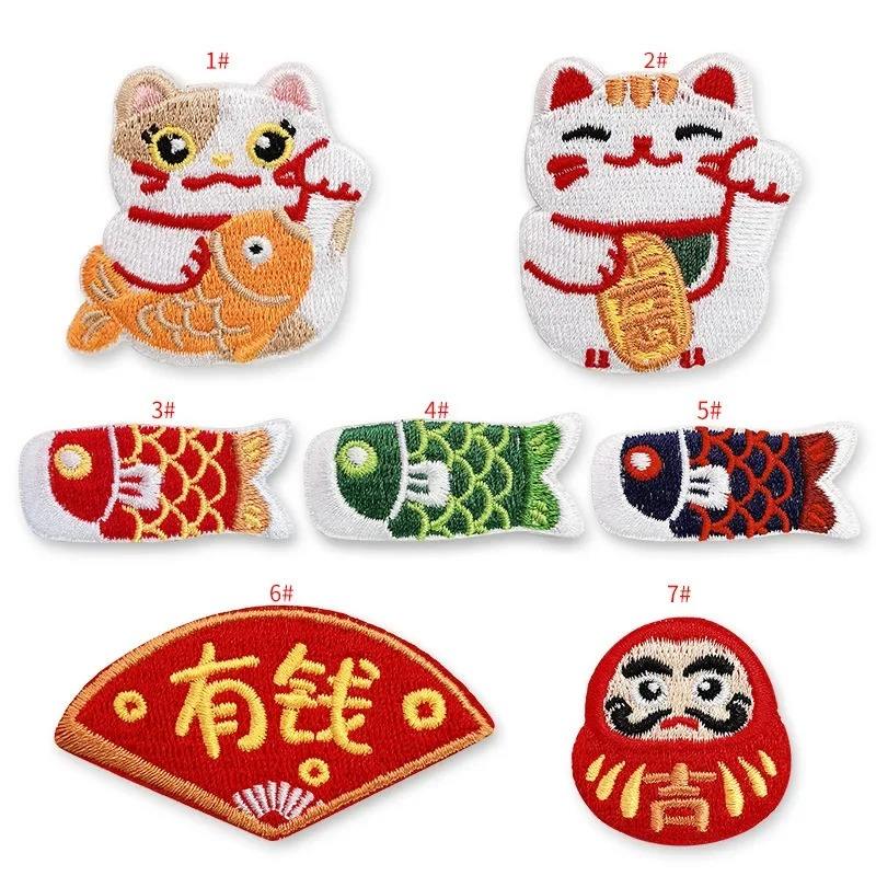 Japan Cultural Embroidery Koinobori Badges Cute Anime Cartoon Rhinestone Lucky Cat Pin-On Patches Dharma Doll Folding Fan