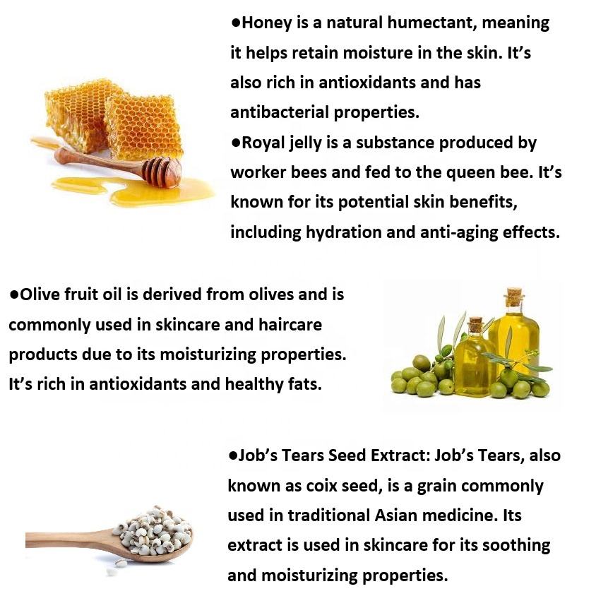 Shea Butter, Hyaluronic Acid, Ceramide, Honey, Royal jelly, Collagen