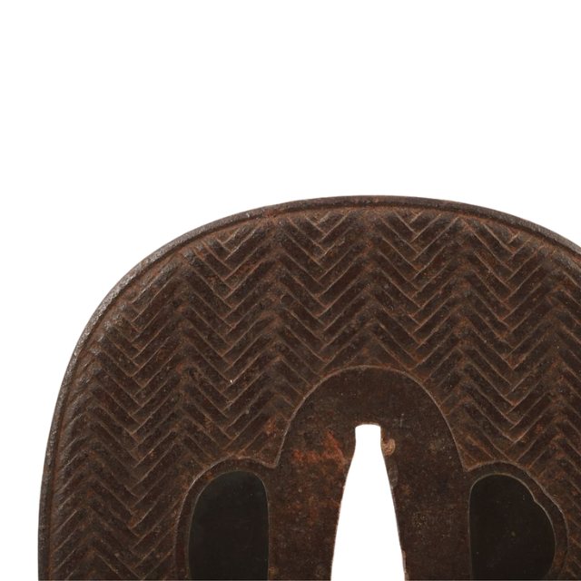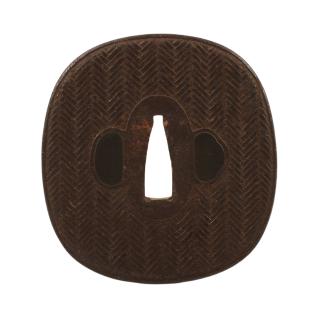 Japanese Edo Period Iron Sword Guard with Asa-Jiro (Basket Weave) Design and Nakago-Maki (Curved Corner) 8.52cm X 7.98cm