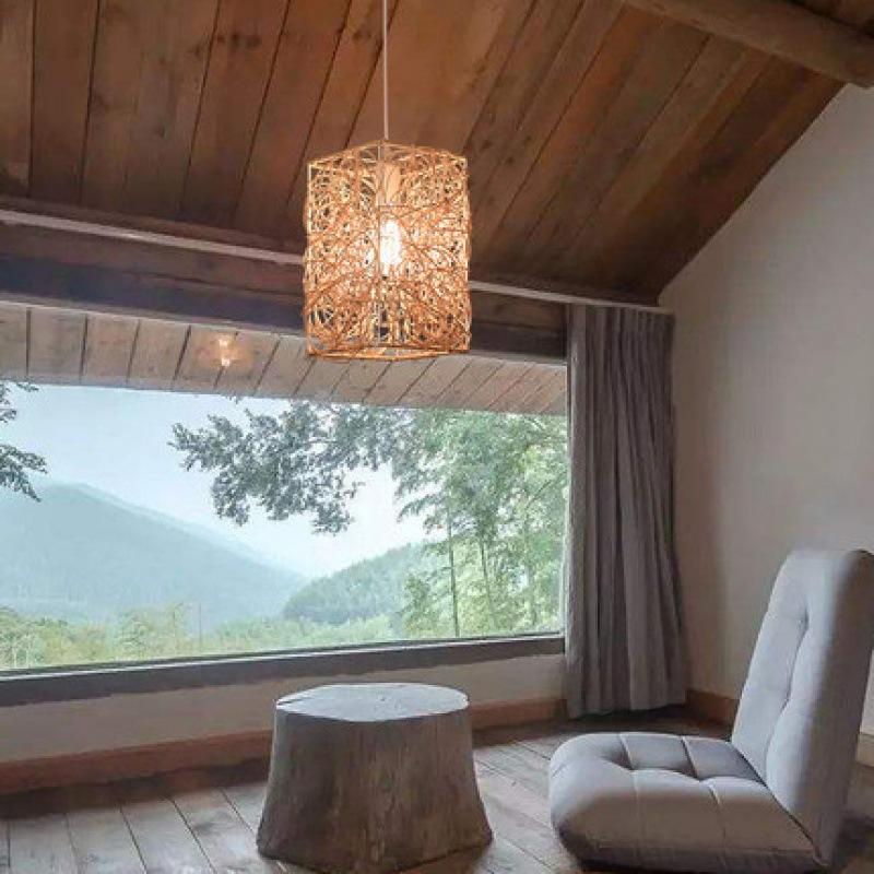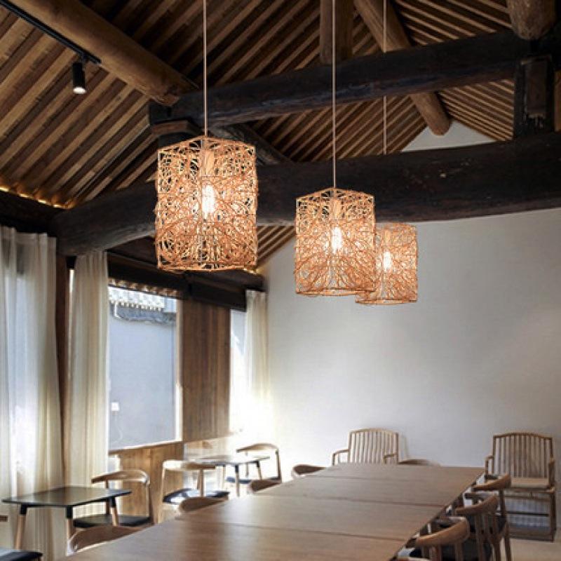 Japanese Style Rattan Chandelier Square Three Headed LED Pendant Light For Restaurant Guesthouse Commercial Use
