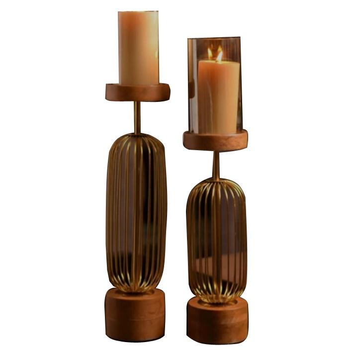 Japanese Style Wooden And Glass Candle Stick Stand Set Of Two With Antique Finishing For New Year And Birthday Party Decoration