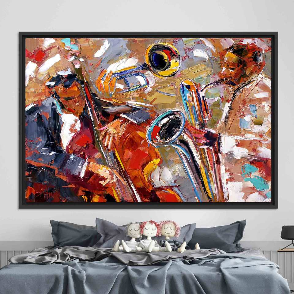 Jazz Music Canvas Wall Art: Saxophone, Cello, Trumpet Print,BLACK FRAMED CANVAS