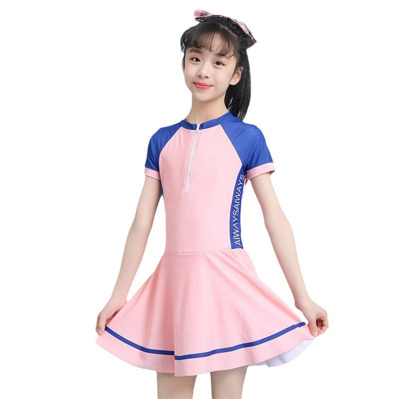 Jiehu Girls One Piece Swim Dress Pink Blue Zipper Quick Dry Anti Uv Swimwear For Children Size Medium Large