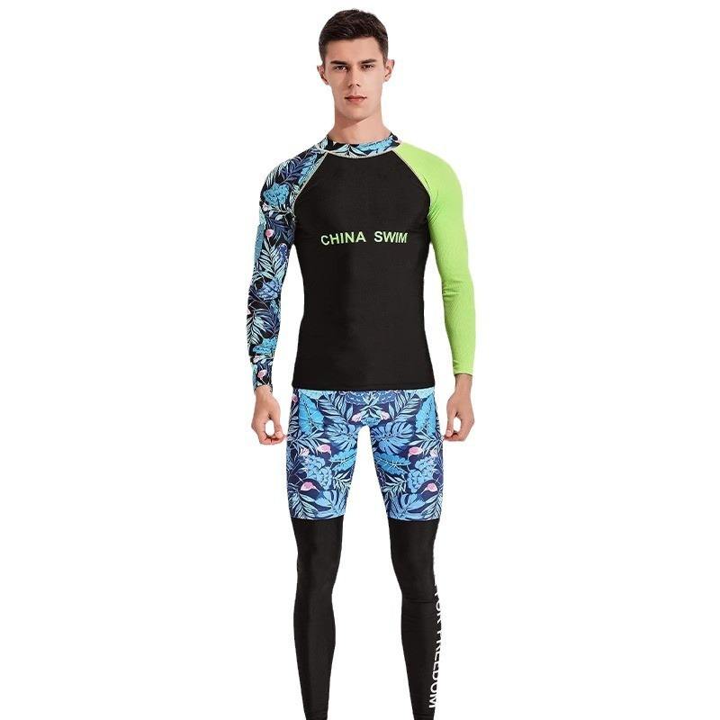 Jiehu Men's Swimwear Set Long Sleeve Printed Board Shorts Four Way Stretch Swimming Running Wading Mid Waist Knitting Adult