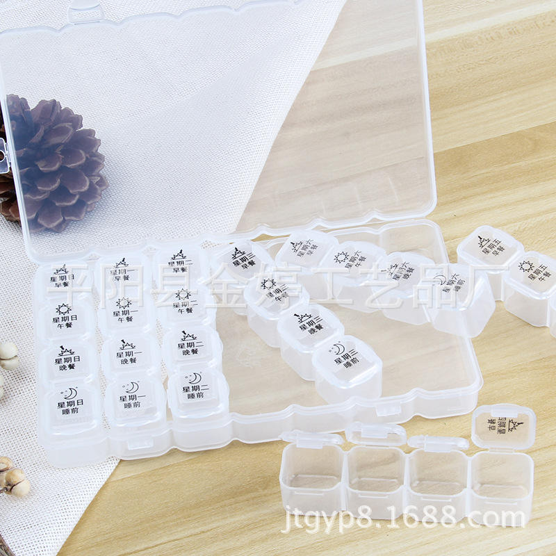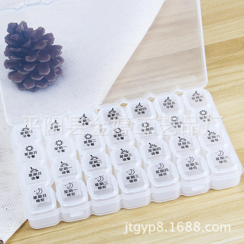 Jin Ting Transparent Plastic Curved 7-Day Pill Dispenser 28 Compartment Mini Portable Medical Case for Morning Noon Evening Use